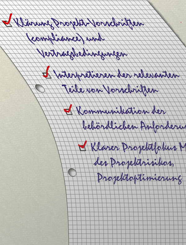 - Klärung Projekt-Vorschriften (compliance) und Vertragsbedingungen